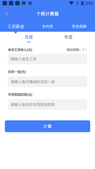 4、回到首页,点击个税计算器,输入相应的数据,即可查询个人所得税缴纳信息。