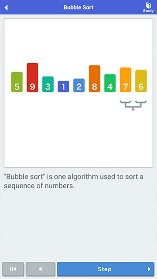 2、进入算法学习界面后,上方为算法运行过程图解,下方为算法运行过程描述,点击下方的Step可让算法继续运行