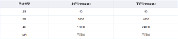 在【场景模板】中选择不同的网络类型,带宽限制如下表: