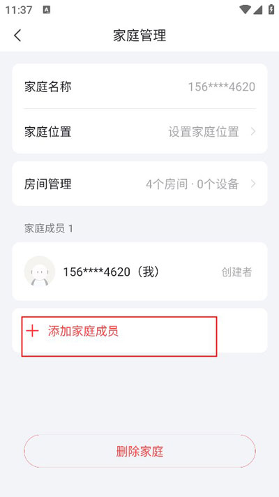 3、点击添加家庭成员,就可以通过输入家人手机号邀请家人进入