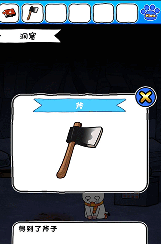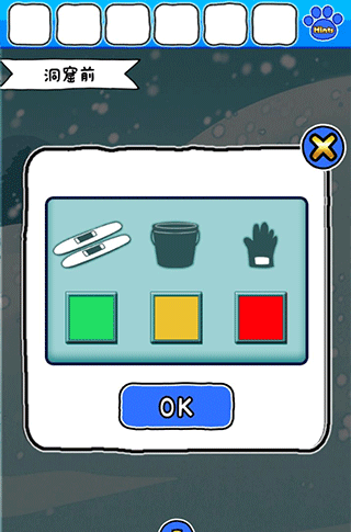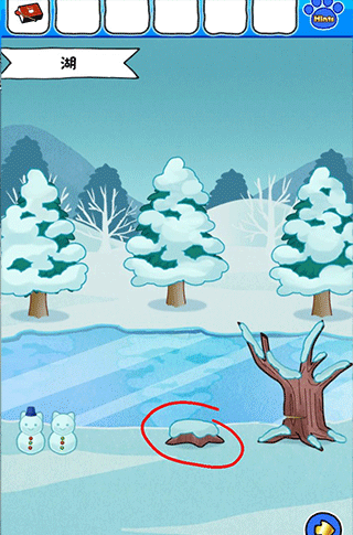 2、利用“铲子”铲开旁边的雪堆,解救猫老大,而猫老大则会将【洞窟前】的雪人推开,解锁新地图~
