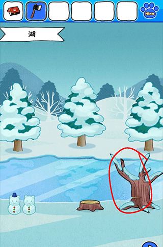 2、来到最右边的【湖】,点击木桩,擦干净上面的雪,就可以知道【洞窟】中左下角箱子的答案了,从而获得“斧头”。