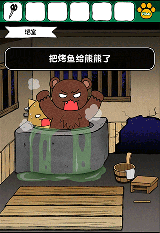 5、得到金鱼和剪刀金鱼放回石塘,拿到打火机。点燃烤鱼的火,得到烤鱼,给熊吃