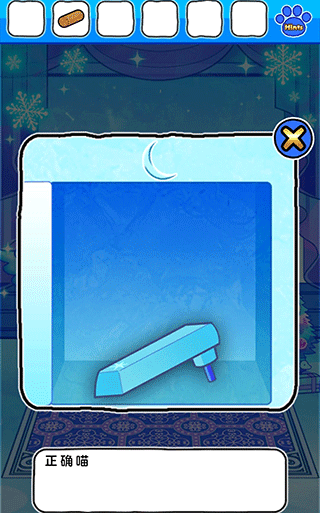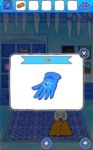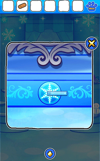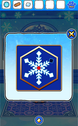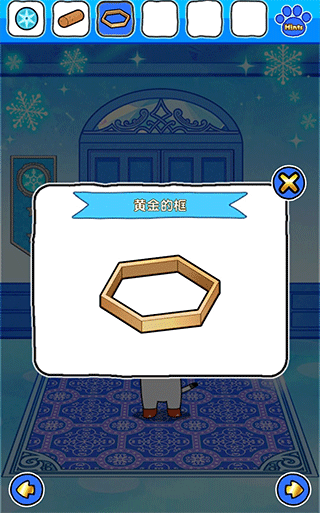 1、首先,点门旁边的雪花中心的红色按钮,出现凹槽,在镜子界面的雪人可以收集到金色框和塞子,独角兽挂画界面的树上收集到圆形装饰