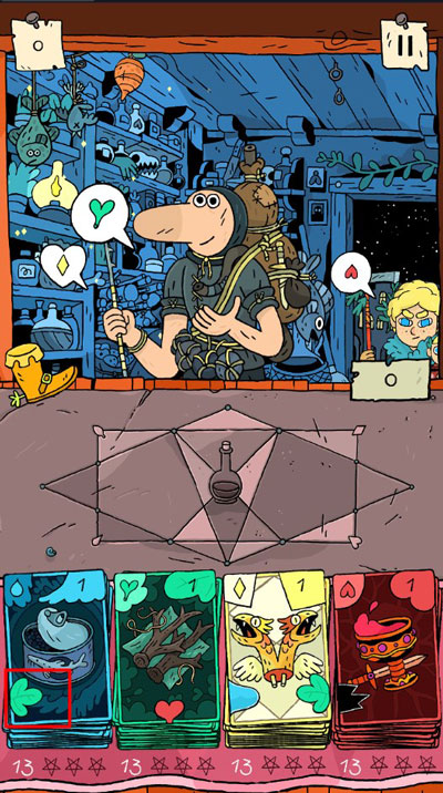 8、每一位客户的订单都是不同的,上方的气泡里显示的就是他需要的药剂成分,下方的气泡则显示他真正喜欢的成分,你至少需要使用一张他需要的成分卡牌