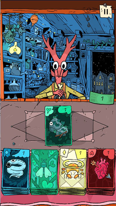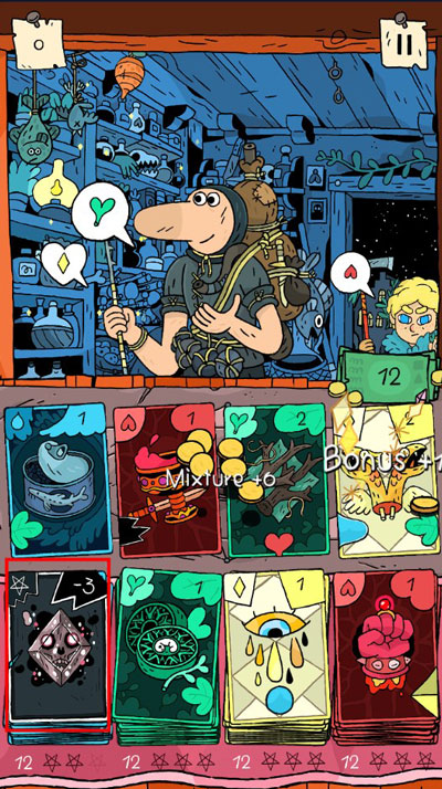 《奇迹商人》是一款单人纸牌风格的药水酿造游戏,玩家扮演炼金术士学徒,通过合成卡牌为顾客制作所需药水。每局开始时有四叠颜色各异的卡牌(蓝、绿、黄、红),每种13张,每次需用四张卡牌组合成药水。卡牌左上角和右下角分别有不同的标志:左上角代表顾客需求元素,右下角则显示是否可以与其他卡牌组合。