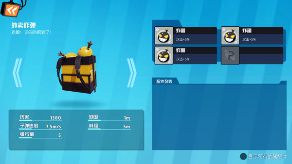 外卖bomb,个人最喜欢的投掷武器!优秀的射程和子弹速度以及不俗的伤害,在乱战和地形狭窄的地图上能起到非常好的效果!