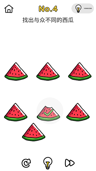 4、找出与众不同的西瓜——拖动西瓜,下面有一块被咬了的