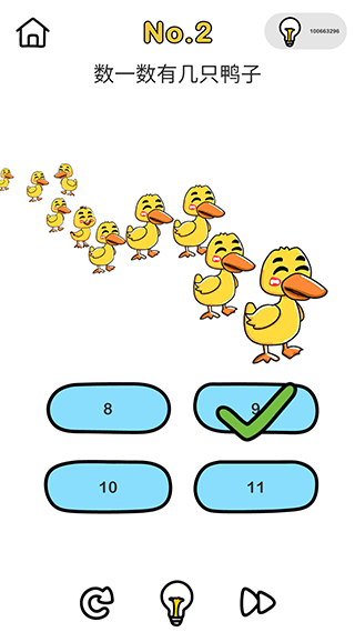 2、数一数有几只鸭子——9只,还有一只是小鸡