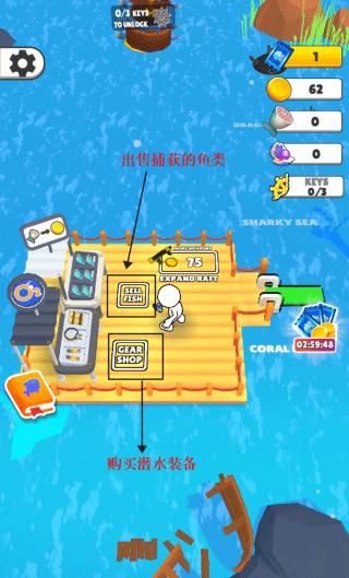 4、当潜水时间到达上限,回到展台时,可以出售捕获的鱼类,换取货币,交换购买潜水道具