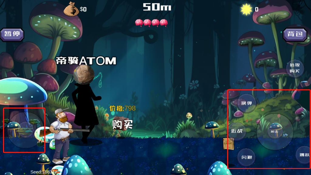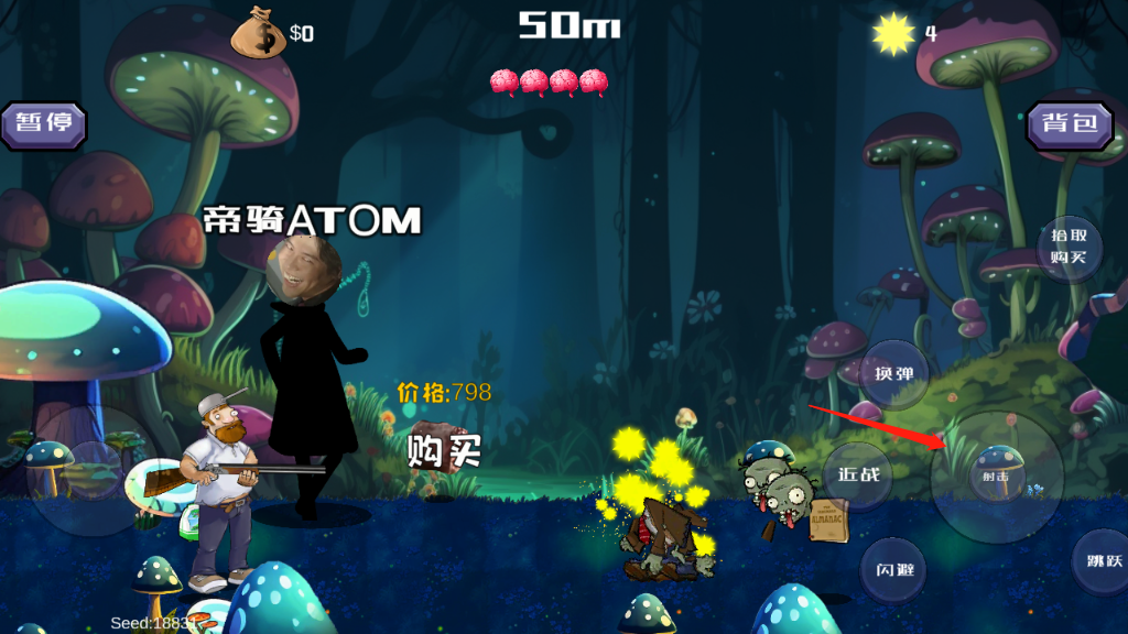 2、左边控制角色的移动,右边则负责攻击僵尸;中间上方像脑子一样的图标是角色的生命,当全部被僵尸吃掉后,游戏就会结束;