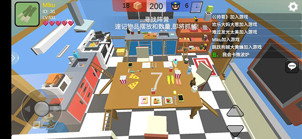 躲猫猫大乱斗是一款多人在线3D捉迷藏游戏,整体采用了3D贴图与动态光源的像素方块拼接合成,虽然是像素风,但是却不会有卡顿的感觉,整体色彩搭配清晰明亮,配色更贴近于小时候玩的益智游戏,让玩家可以找到童年的感觉。而游戏场景大多设计成了箱庭式,将地图分成块状的区域,在有限的场景中营造出相似却又区别明显的独立房间,这样的设计可以更好的让玩家从视觉上、感官上延申地图的规模,对于记图党来说也是一件好事,毕竟每个房间虽然相似但是标志性物品还是有所不同的,玩到次数多了就会潜移默化的记住。另外游戏的背景音乐给玩家的感觉也是非常轻快诙谐的,游戏设定为多人休闲娱乐,两者结合显得相得益彰,非常的有趣。
