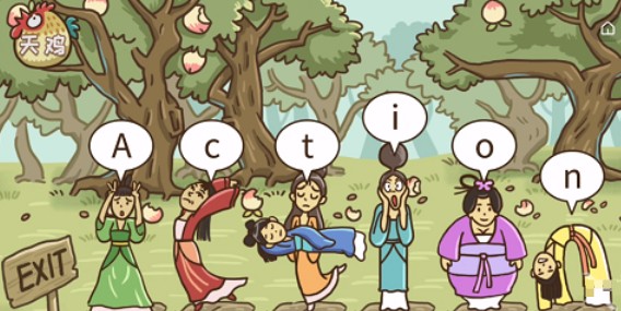 首先我们可以看到每位仙女代表着不同的字母,我们要将这几位仙女按照正确的字母顺序摆放,正确的通关顺序就是“action”,将对应这几个字母的仙女按顺序摆放即可通关成功。注意字母“t”是需要两位仙女组合在一起才可以,如图所示,穿橙色衣服的仙女要和穿蓝色平躺的仙女进行组合,这样就会变成字母“t”。