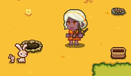 ● 带着篮子装着尖石出门寻找牛蒡,挖出牛蒡,把牛蒡和尖石放入篮子回家。到荒地找扁石带回家,把牛蒡放在扁石上,用尖石将牛蒡捣碎,就成了一份兔子诱饵。