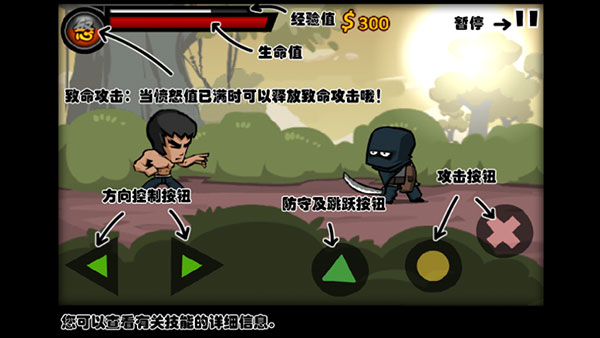 进入游戏画面,首先在左下方的方向键,右边则是一些打仗的按键,三角形的防守反击,圆圈是普通的打击,叉子是蓄力一击。左上面还有血量和怒气选择,怒气是大招,点一下即可释放能量全灭敌人。游戏中打败敌人会出现—些道具,比如谩头之类让你加血的