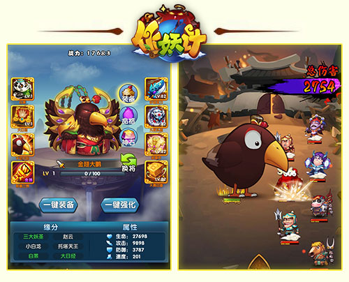 称霸三界合体技:对敌方全体造成75%伤害,本次暴击率提升30%,暴击伤害提升10%。 悟空(佛)、金翅大鹏(佛)、牛魔王(魔),皆属橙色卡牌,三人同时上阵,可释放猴、鸟、牛的超现代轰炸“称霸三界”合体技,无厘头的现代战斗画面,对敌方造成的伤害也非常高。