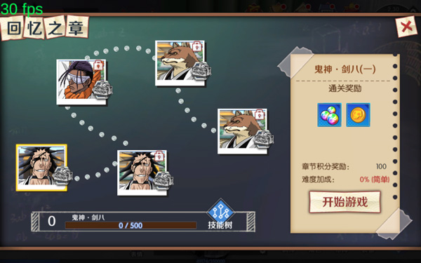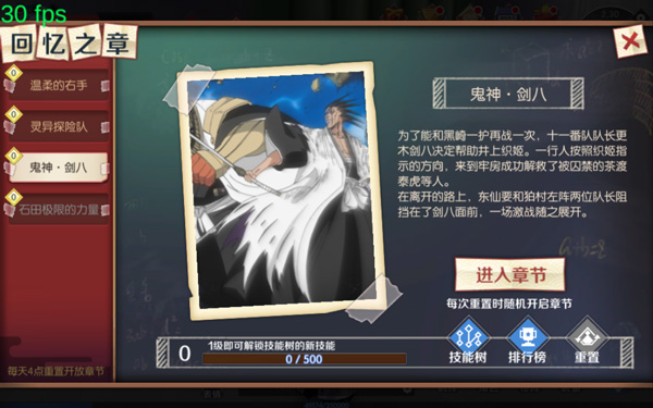 回忆之章 可以通过右侧玩法按钮进入,目前开放了四个章节,分别是:温柔的右手、灵异探险队、鬼神·剑八、石田极限的力量;都是动画中的剧情哦。