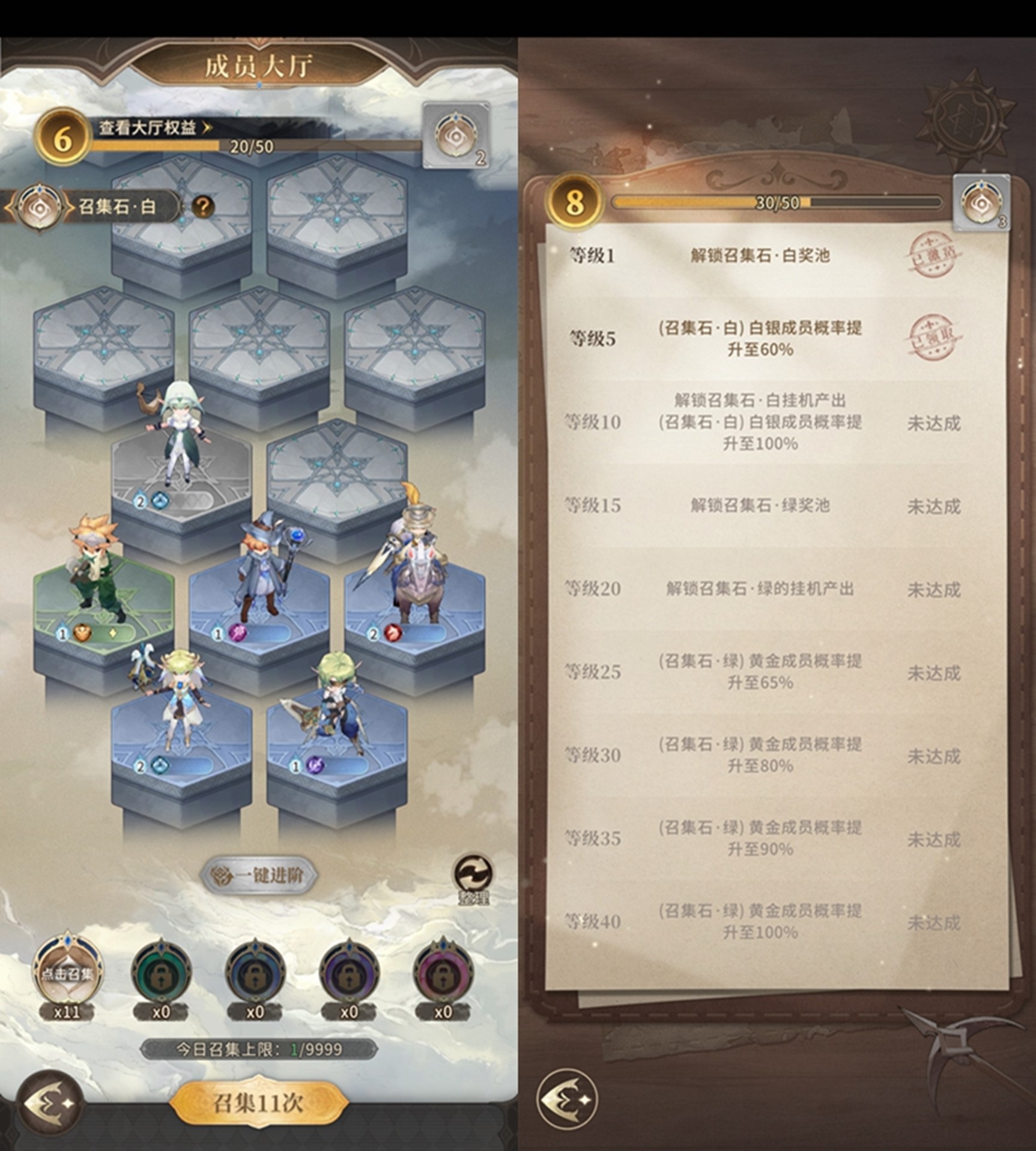 至于各种品阶出现的概率分布则是与我们的【成员大厅】等级有关。我们每次召集成员都可以为召集大厅累积经验,经验累积到一定程度召集大厅的等级就会提升,每次召集大厅等级提升,我们都可以召集石奖励。另一方面,召集大厅等级每提升5级,召集功能都会发生巨大的变化。比如召集15级我们会解锁【召集石·绿】的奖池,这意味着我们在召集大厅15级之后才能使用【召集石·绿】来召集成员。而到达20级之后我们的庄园就可以挂机产出【召集石·绿】了,因此建议大家每隔一段时间就把召集石用掉,尽快将召集大厅的等级提升上来,好处多多哦!