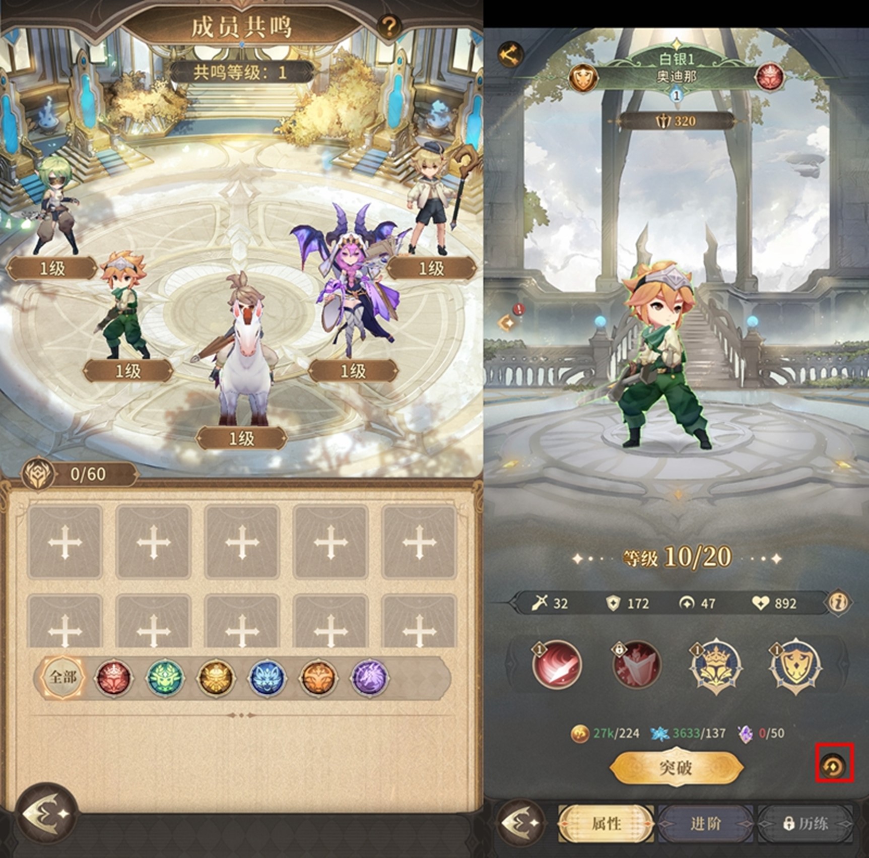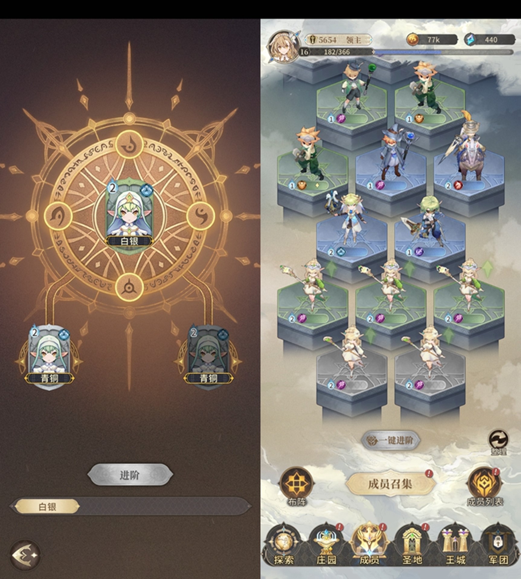 当我们在成员大厅召集到相同品阶的成员时,就可以使用成员页面中的进阶功能,让两个相同品阶的成员进行合成进阶,成员品阶从青铜、白银、黄金、铂金、钻石、圣域、传奇、半神一共分了八个品阶,每个品阶需要进阶的次数也会增加,前文提到的成员等级上限也取决于成员的品阶。进阶也可以通过在召集大厅拖动相同品阶的成员完成,在手动拖拽30次进阶之后,我们还可以解锁“一键进阶”功能,非常方便。品阶提升之后,角色的基础属性会有一个质的飞跃,如果在冒险中卡关了,不妨试试成员召集提升队伍中成员的品阶吧!