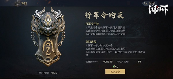 行军令每天只能恢复24个,【采集】一次资源便需要消耗3个行军令,完成赛季事件一样需要行军令。可以说行军令属于稀缺资源,千万不要浪费。建议前期将行军令多用于【采集】。