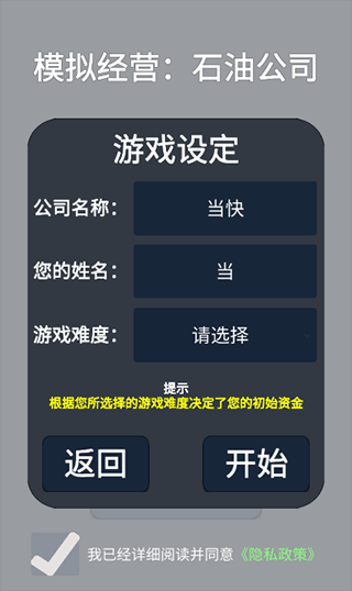1、进入游戏后,设定公司名称和姓名,可以选择游戏难度,分为简单,普通两种难度,不同难度初始资金不一样