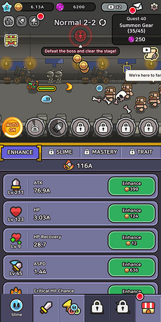 史莱姆传说是一款放置挂机类角色扮演游戏,又名为史莱姆大冒险、slimeidle,采用可爱的卡通画风,搭配魔性洗脑的音乐,让玩家刷到停不下来。玩家将在游戏中扮演一名史莱姆,而需要做的就是不断击败敌人获取金钱,升级装备以及属性,操作起来非常简单,仅需等待拥有足够的金钱并升级属性即可,战斗过程全程自动,让玩家游戏生活两不误。并且除了一些基础的属性可以升级之外,还为玩家提供有各种装备和宠物,可以让玩家的史莱姆拥有更加强力的战斗力,轻松即可通过大多数的关卡。遇到关卡挑战失败后,还可重复在前一关卡刷等级,体验秒杀boss的快感,非常适合挂机休闲党游玩,目前唯一的缺点就是暂时不支持中文了,感兴趣的玩家快来本站下载游玩吧。