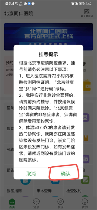 1、打开北京同仁医院预约挂号app,在首页找到并点击“预约挂号”按键后会出现挂号提示,用户要详细阅读,并确认。