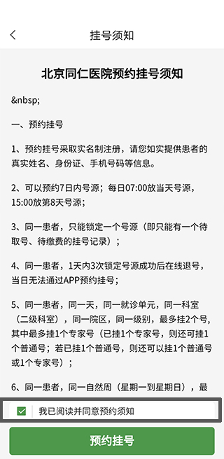 2、随后需要在预约须知中看清要求,并勾上“我已阅读并同意预约须知”后,点击“预约挂号”按键就可以了。