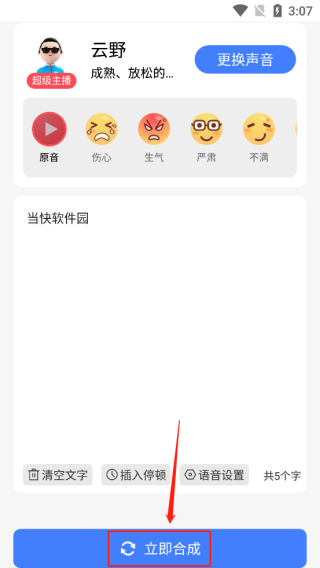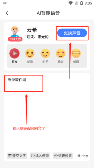2、在图示文本框位置输入需要配音的文字,点击上方更换声音可以选择不同的声音