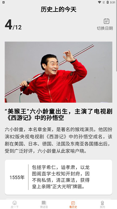 皮皮达人app是一款集开心一刻、刷故事、猜谜语和看历史于一体的软件。在开心一刻中,用户可以轻松愉悦地浏览简单的笑话来放松自己,在快节奏的生活中获得一段放松时光;在刷故事模块中,用户可以了解到各种成语故事,扩展自己的知识面,并且通过故事的情节与主题,感受不同的文化与思想的魅力;在猜谜语模块中,用户可以挑战自己的智力与思维能力,猜出精彩的谜底,展现自己的猜谜技能;这既有锻炼大脑的作用,也能让使用者在猜对后感到满足与喜悦;在看历史模块中,用户可以每天浏览今日历史上发生的重要事件,了解历史沿革与演变,增强自己的历史素养,也能让用户更好地理解当今社会和人类文明的发展历程,以及我们所处的时代背景。