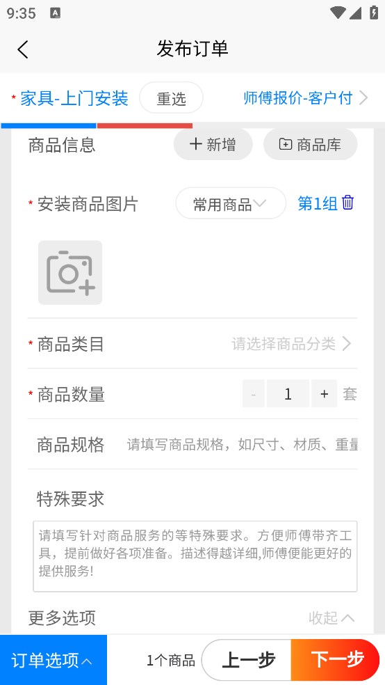 2、按照要求填写订单信息,如客户地址、上门时间、商品图片;