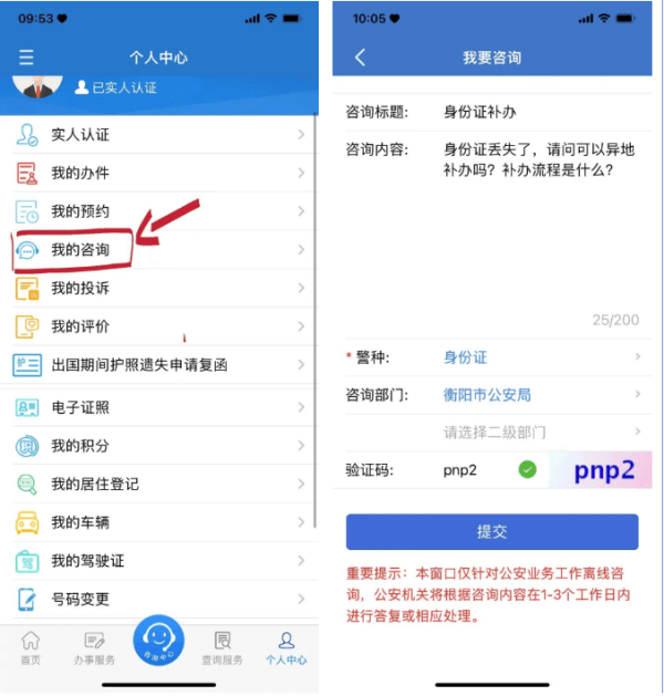 除此之外,我们还设立了针对公安业务工作【离线咨询】模式,公安机关将根据咨询内容在1-3个工作日内进行答复或相应处理;登录湖南公安服务平台,进入首页,点击个人中心-我的咨询-我要提问,按提示输入咨询要求,最后点击提交等待回复。
