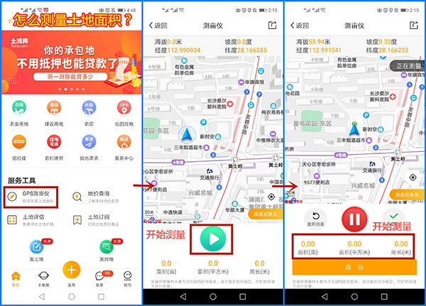 全程GPS卫星定位。绕土地行走一圈,纪录行走路径,计算土地面积,专业、准确