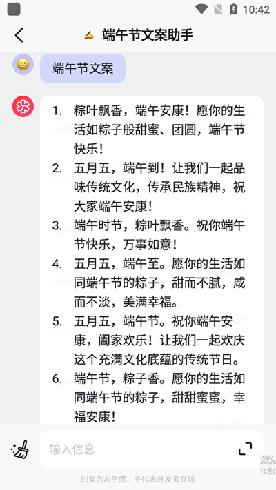 比如让它写一篇关于端午节的文案,几秒钟之后就可以推出端午节的一些短句!