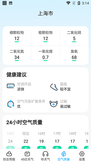 6、在空气质量栏里,可以查看当前城市的空气质量情况以及健康建议等信息,非常的方便。