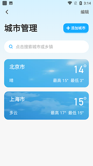2、点击首页左上角可以添加更多的城市,查看对应城市的天气状况。