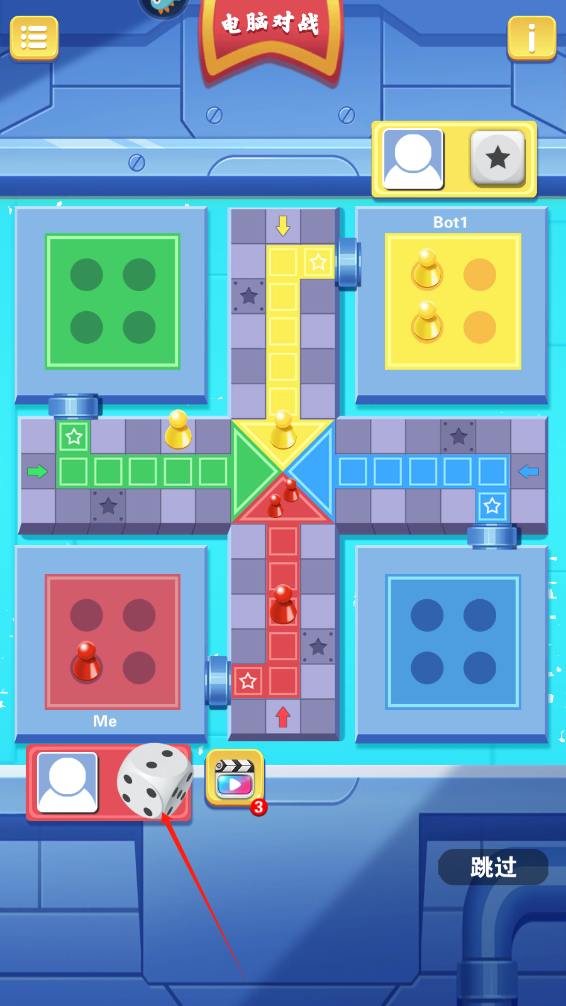 1、进入游戏,点击骰子开始游戏,开局只有骰子掷到6点,棋子才能出发