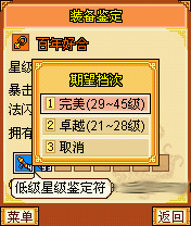 然后点击自动鉴定即可。自动鉴定档次分为两档,一档是卓越,也就是鉴定出的品质在21~28之间的属性,另一种则为完美品质,品质等级在29~45之间。自动鉴定开始既不可终止,直到金钱、鉴定符用光,或者出现期望的档次才会停止。