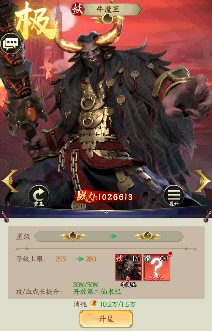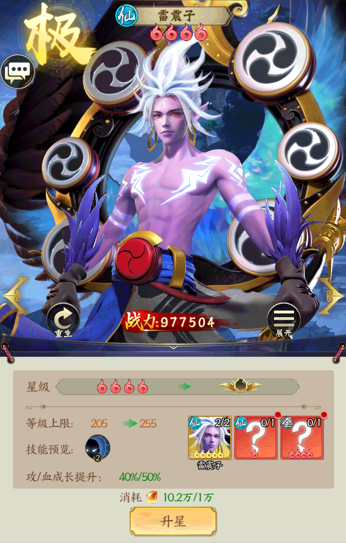 ◆ 二郎神是前期就能免费领到的强力五星绝属性神仙,前期可以将大多数资源集中在他的身上,培养到9星,如果后续有更好的神和魔后可以将二郎神重生;