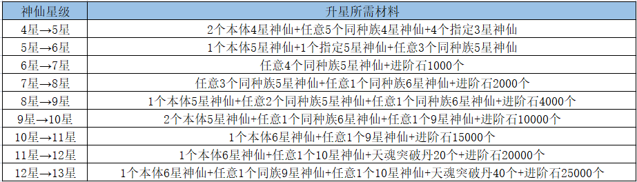 4星神仙升5星神仙需要消耗2个本体4星神仙+任意5个同种族4星神仙+4个指定3星神仙。