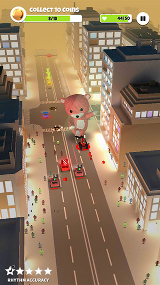 巨型舞蹈公仔是一款卡通风格的趣味休闲闯关类游戏,玩家在游戏中将要操控一只巨型的毛绒玩具在城市的街头上进行舞蹈破坏,这期间你需要随着音乐的节奏舞动起来,通过舞蹈的步伐来躲避各种攻击,不停的在四周移动,摧毁那些看上去十分渺小的拦路车确保成功的到达终点完成闯关。此外,在巨型舞蹈公仔游戏里你还可以任意选择改变角色的外形,游戏内目前有着多种组合方式,无论是你的公仔纹路,颜色,都可以在游戏中修改,感兴趣的小伙伴们欢迎在本站下载体验。