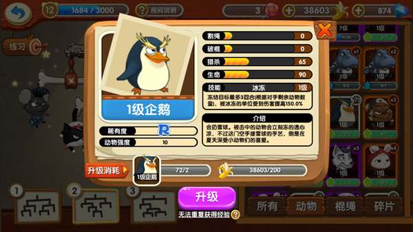 目前游戏中拥有二十多种动物、十多种棍绳,需要根据动物和棍绳不同的特点,可以自由组合、选择阵型进行搭配,以达到出其不意而又合理的效果,在组合好阵容后,进行匹配,在战斗中又需要根据对手的阵型选择最合适的打法,更需要操控好每种动物的弹道,否则再好的动物和阵容也是功亏一篑哦