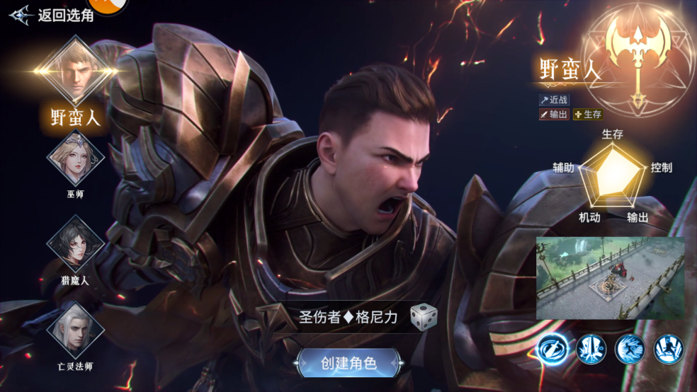 野蛮人是勇者的后代,以强硬的体力和剑术为本的近距离攻击型角色。具有使用剑、盾等多种武器的能力。能够使用重型武器,具有很高的单体输出能力,同时具备高防御,能够冲锋在前列,是最先吹响战斗号角的先驱者,伤害输出与肉盾的完美结合。