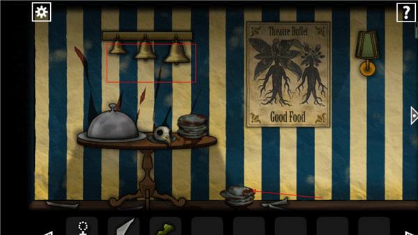 返回到之前通过铃铛拿到眼球的地方,在这里如图点击213122,接下来就可以在下面的餐盘当中拿到脑子。