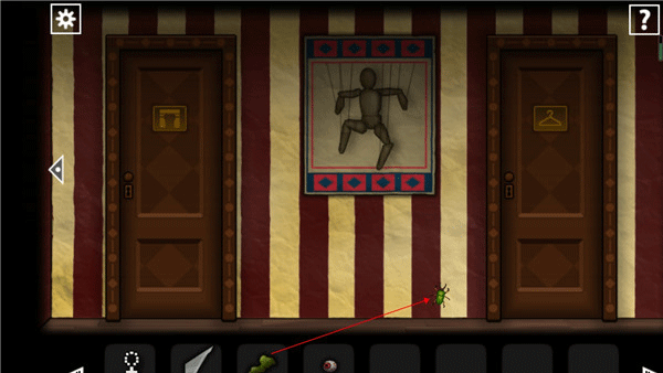 6、出来往右边走,来到墙上有一个甲虫的地方,点击这个甲虫进行捕捉,在这个地方是无法直接捕捉到这个甲虫的,首先将之前餐盘上面发现的黏乎乎的东西放到上面,甲虫会粘在上面这样才能获取。