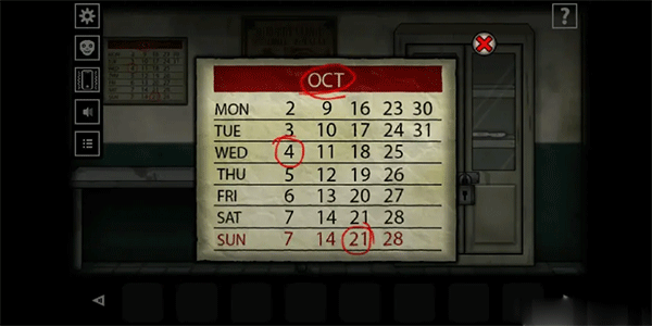 在第四个房间(医务室)醒来后,观察墙上的日历,发现标注为OCT的日期,推算得到密码为「10421」。接着输入密码打开下面的抽屉,获得一串钥匙。