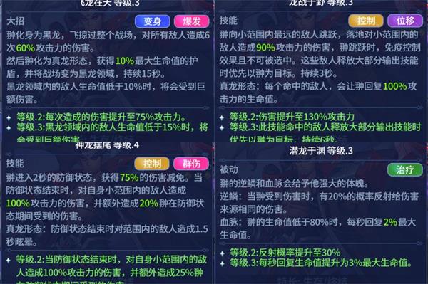 技能“太极”能给全体队友提供一个很厚的盾,同级别战力下约等于无敌十秒了。其他技能的输出和控制能力都不错,自身的血量也较高。