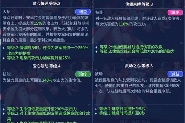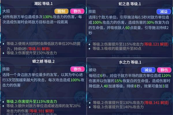 可以看出来,白的技能以群伤为主,伤害比例也不低,能对全体敌人产生较大的消耗,同时附带击退、回血、减速等各种buff。