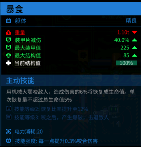 三个关于躯体的内容说完后,接下来要进入第二阶段,那就是躯体的选择。因为合金重组里的躯体(其实不只是躯体,其他模块同理)是五花八门的,比如说这款减伤、血甲都低,但是有能够回血的技能。