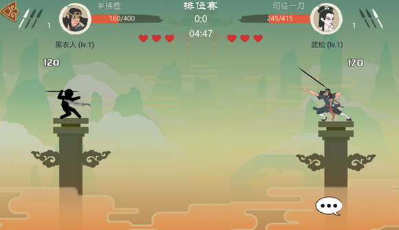 在游戏中,玩家在对战中每次和对手都有可能出现在不同的高度,只需要掌握一定的投掷抛物线射击的技巧,尽量瞄准头部,扔出自己的武器,就可以获得最大化伤害。通过瞄准射击,从而赢得比赛的胜利。